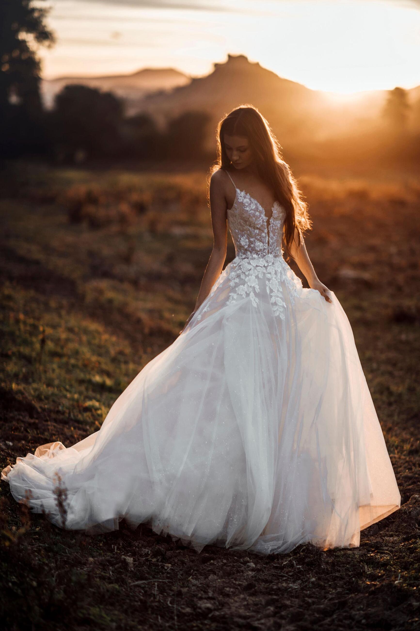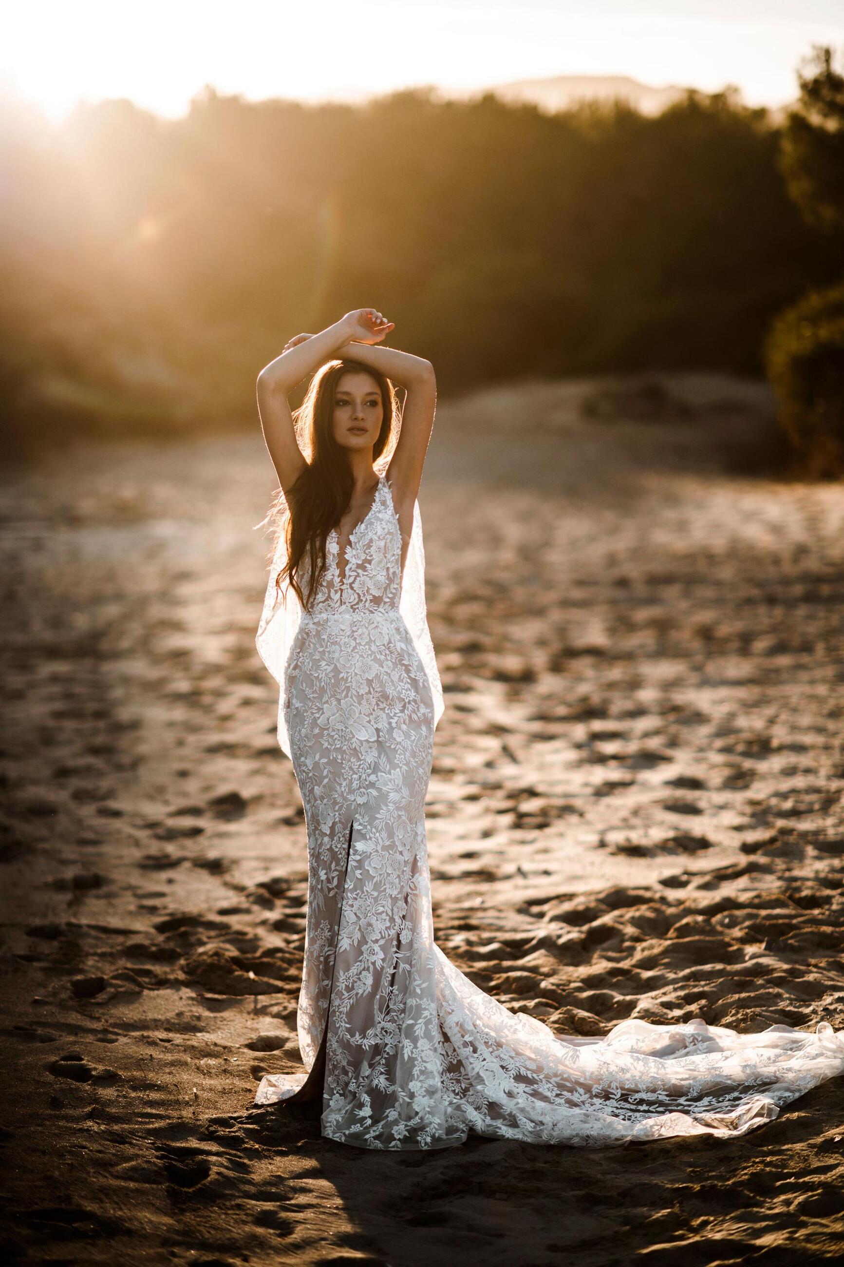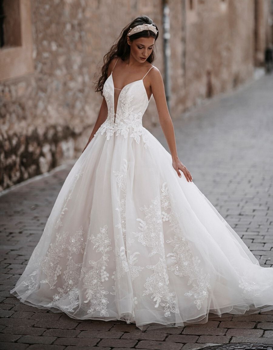 Grounded in European design and inspired by balletic, ethereal silhouettes, the Abella Bride collection is an elegant and unique addition to the Allure Bridals brand family. Abella shines with an emphasis on chic, understated drama found in the collection's translucent bodices and floral work, maximalist trains, and delicate illusion detailing.
